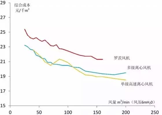 羅茨風機與多級離心風機不同的風機有著不同的適用范圍,曝氣的流量范圍也有較大的差異,羅茨風機在小流量范圍,多級離心中流量范圍,單級高速離心風機在高流量范圍。羅茨風機:1~100m3/min;多級離心風機:20~400m3/min;單級高速離心風機:40~1000m3/min。 三種風機的流量與功率的比較見下圖。 流量與功率比較圖 從上圖中可知,在風機的效率方面單級高速離心風機最高,多級離心風機其次,羅茨風機最低。同樣的供風量,羅茨風機能耗最高,單級高速離心風機能耗最低。 從設備采購成本看,羅茨風機成本最低,多級離心風機居中,單級高速離心風機最高。綜合考慮能耗、設備采購及運行維護費用等因素,三種風機的流量與單位綜合成本比較見下圖。 流量與單位流量綜合成本比較圖 其中,羅茨風機由于能耗較高,單位流量綜合成本高于多級離心和單級高速離心風機。在100m3/min以上的流量時,由于單級高速離心風機具有更高的運行效率,綜合成本優(yōu)于多級離心風機。 綜合考慮,在小流量范圍內(nèi)羅茨風機具有價格優(yōu)勢,在中流量范圍內(nèi),多級離心風機性價比較好,高流量時,單級高速離心風機綜合成本最低。在實際選型中還要考慮流量調(diào)節(jié)的需求、安裝條件以及運行維護方便性等因素。